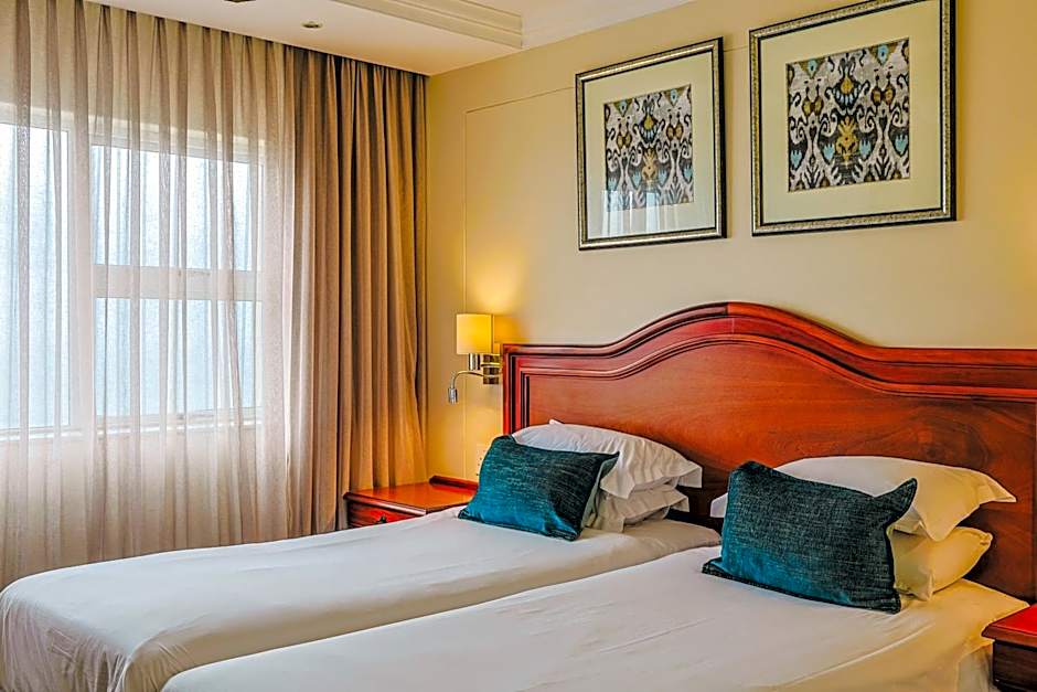 This bright, modern-style room is equipped with 2 single beds, a TV, and wooden furniture. It includes a private bathroom with a hairdryer.